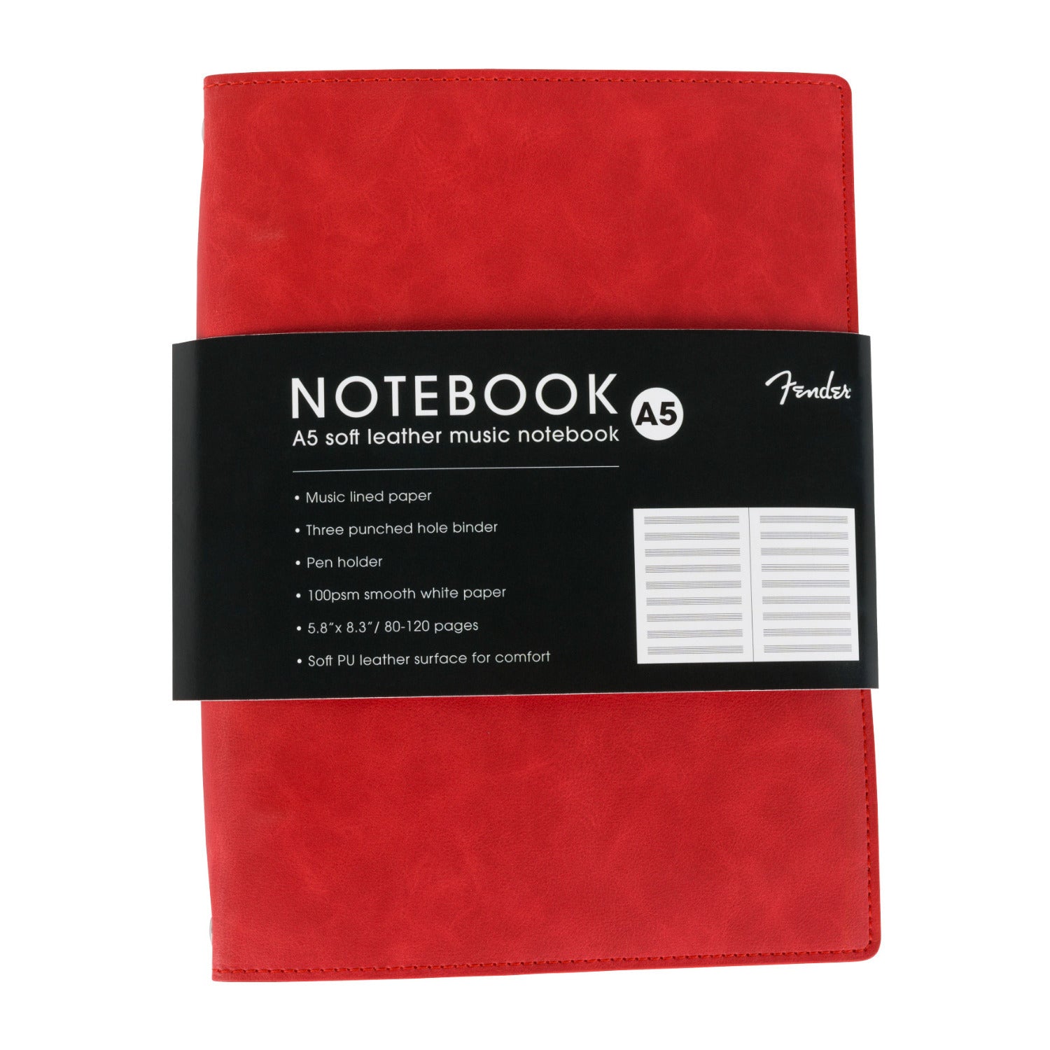 Crafted for musicians and creators, the Fender Vegan Leather Dakota Red Notebook blends style and function in a bold, iconic finish. The smooth vegan leather cover in Fender’s signature Dakota Red evokes vintage electric guitars, offering a vibrant pop of color with a refined, tactile feel. Embossed with the classic Fender spaghetti logo, it’s a statement piece for any artist on the go. Inside, you'll find high-quality, acid-free pages designed specifically for music notation, with clear staff lines ideal for composing, arranging, or sketching out melodic ideas. There are also blank pages for all of you songwriters out there. Whether you're in the studio, on tour, or jotting down riffs at a café we have just the notebook for you!