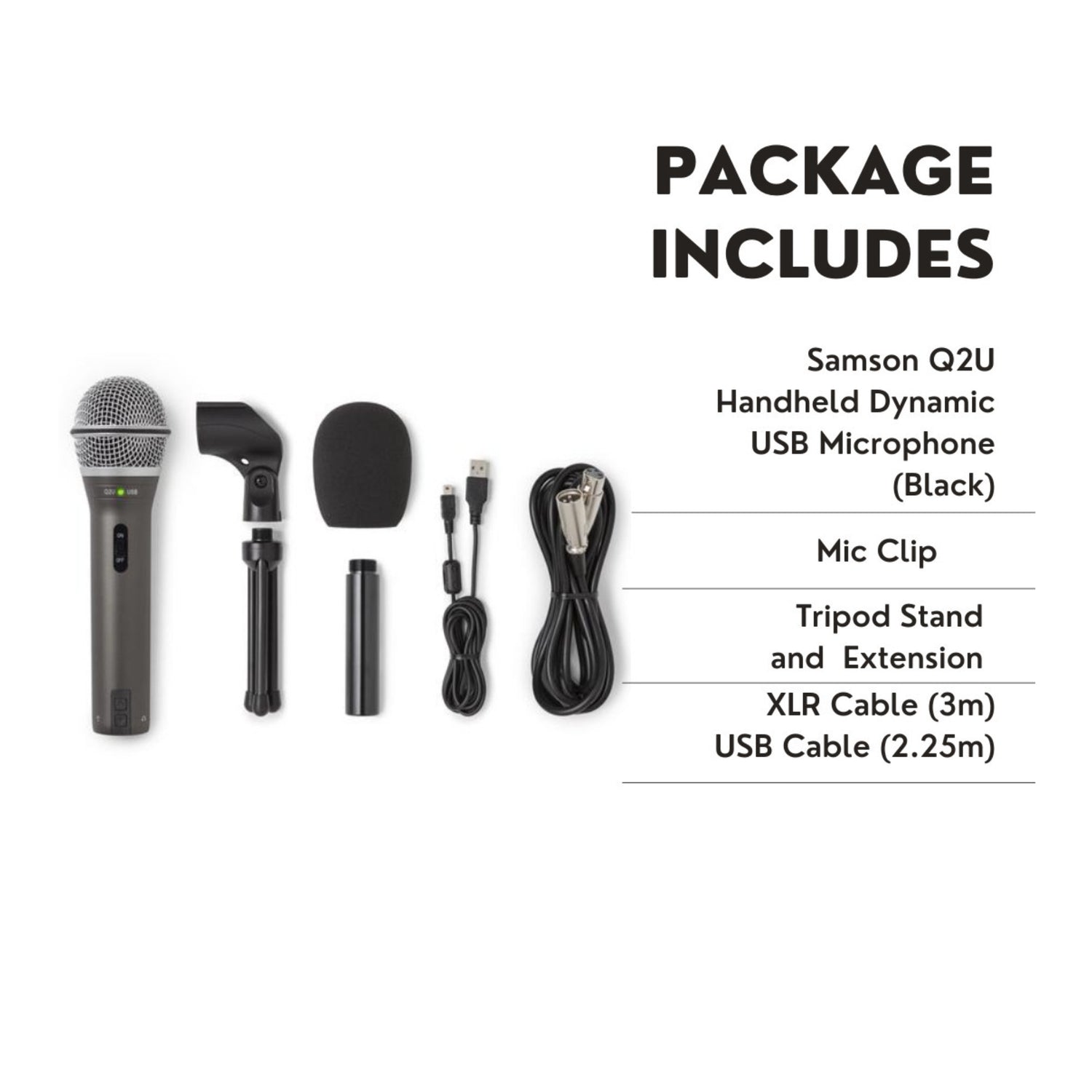 The Samson Q2U is a versatile mic with both USB and XLR outputs, ideal for recording, podcasting, or performing live. It includes all the essentials: mic clip, desktop tripod, windscreen, XLR and USB cables—ready to use right out of the box.