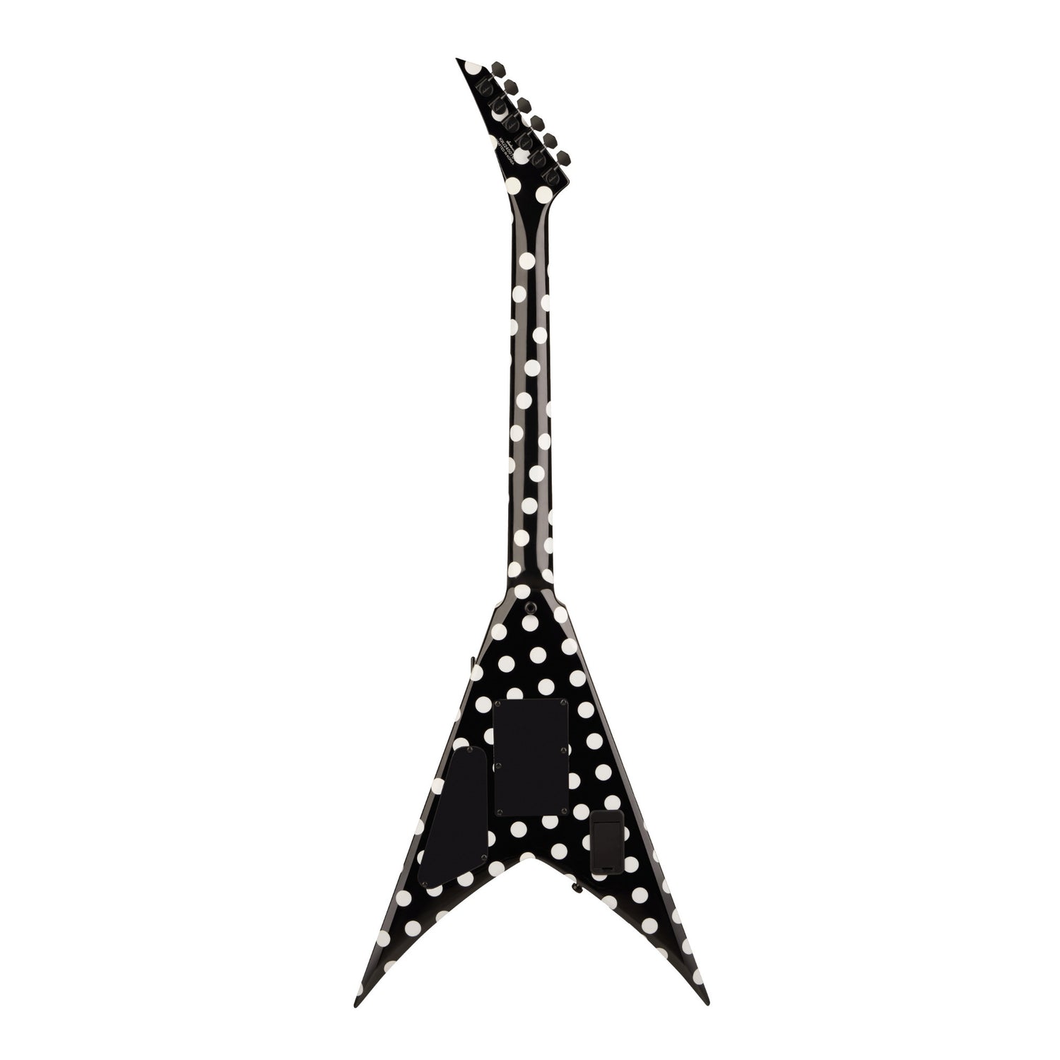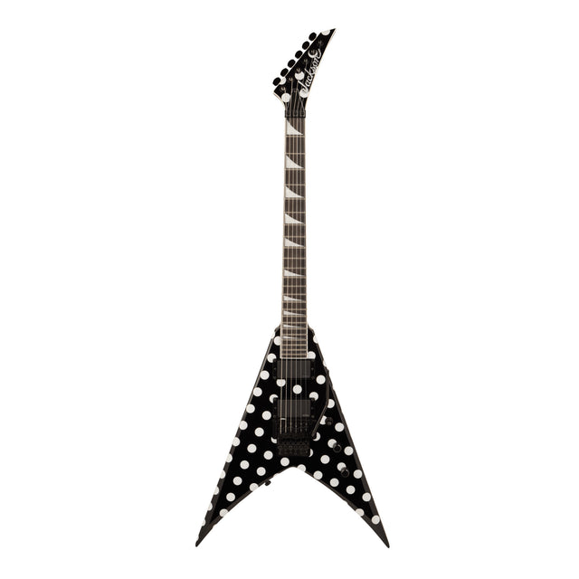 The Pro KV features a mahogany body and three-piece through-body maple neck with graphite reinforcement, crowned by a 12-inch to 16-inch compound radius bound ebony fingerboard with 24 jumbo frets and pearloid sharkfin inlays. EMG 81 and 60 humbucking pickups deliver the aggressive attack and harmonic clarity that defined modern metal's sound. Professional features include dual volume controls, a three-way toggle switch, a Floyd Rose 1000 series double-locking bridge, Jackson dual-locking strap buttons, and the classic Jackson pointed 6-in-line headstock. Dressed in Demmel's signature polka dot graphics with black hardware, this fearsome instrument is built for modern metal mayhem.