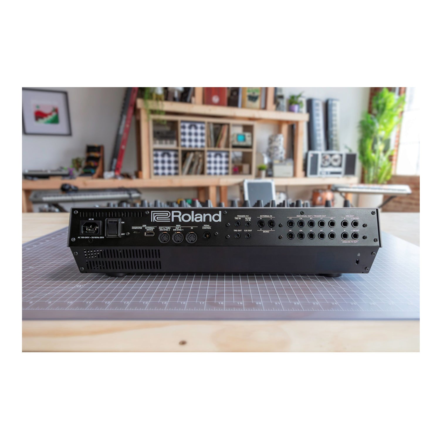 46 GB internal storage; USB flash drive support for backup, restore, import, and export; multiple jacks including MIX OUT, ANALOG FX OUT, INDIVIDUAL/TRIGGER OUT, EXTERNAL IN, PEDAL, MIDI, and USB Type-C for computer audio/MIDI.