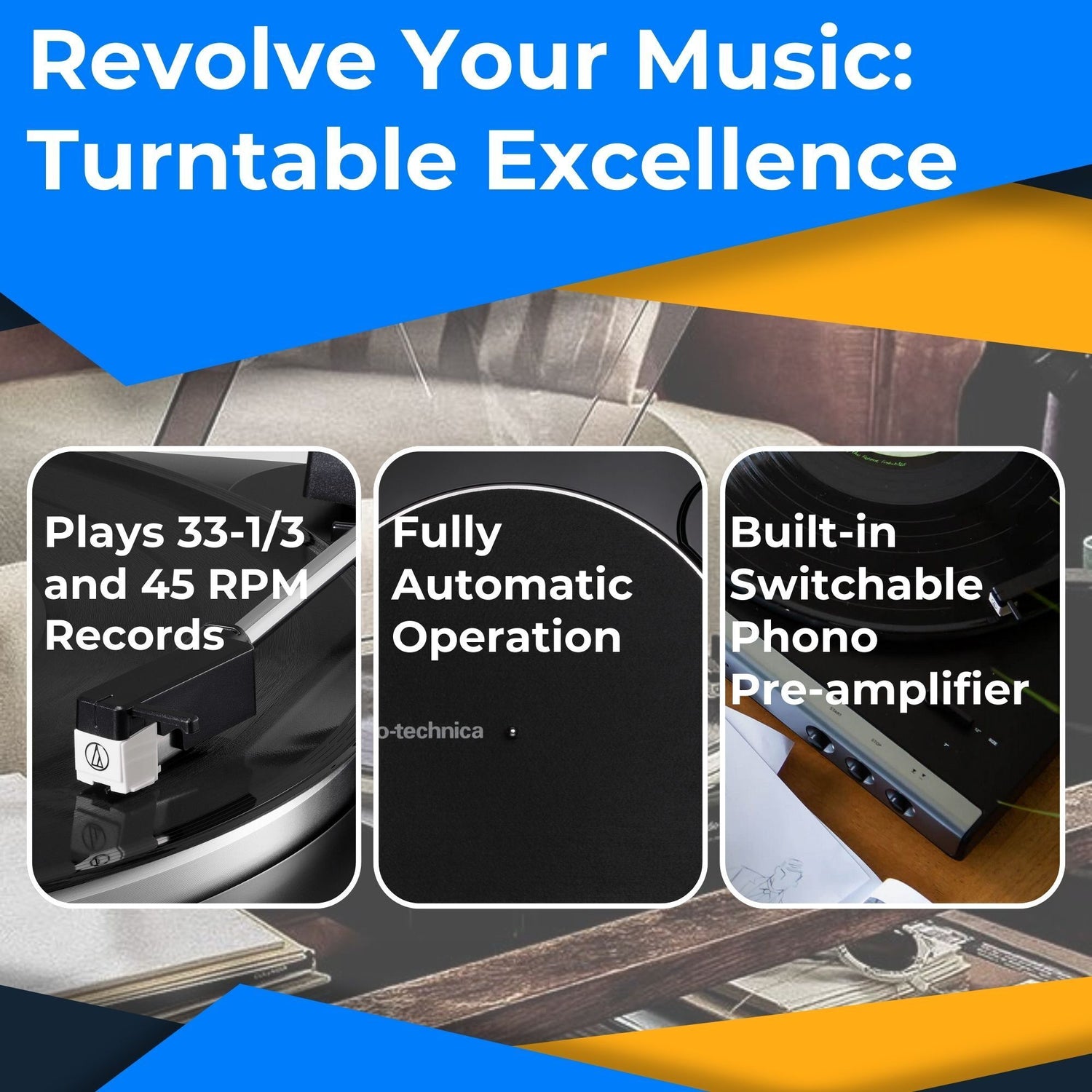 The Audio-Technica Fully Automatic Belt-Drive Stereo Turntable is capable of playing records at two speeds. Play all of your favorite records at both 33-1/3 RPM and 45 RPM. It utilizes an anti-resonance die cast aluminum platter.