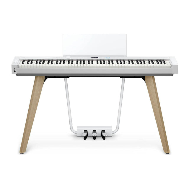 It is designed to fit seamlessly into any interior style. Clean lines and design simplicity look great from any angle and echo the traditional aesthetics and quality of an acoustic piano, including the integrated stand and pedals. The Stand is finished in wood grain with lines that match the piano itself. The color of the speaker fabric matches the body color. This digital piano includes a transparent acrylic music stand. The pedal unit and metal frame all match the body color of the piano, as does the included piano cover. Its flat top panel features an LED touch ring, touch buttons, and a backlit LCD. This is a space-saving Casio with a front-to-back depth of just 242 mm.