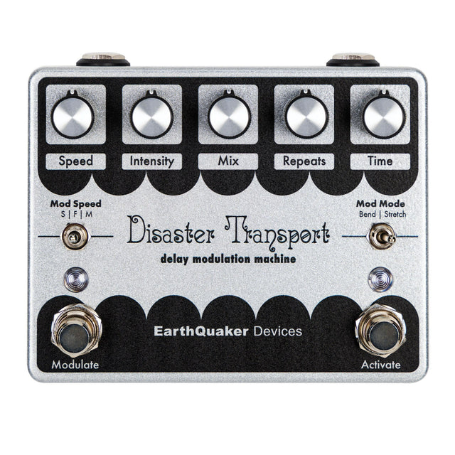 This limited edition version of the Disaster Transport pedal has been redesigned so the delay line reduces the noise floor and improves the quality of the delay. The output is boosted with a cleaner mixing section; it’s now filtered to sound more like an analog delay than any of the previous versions. This delay pedal sits perfectly in the background with more of an evolved ambiance to it, but it can be dialed in for more of a dramatic effect of your choosing. A Mod Mode switch has been added that allows you to choose between bending (Bend) and stretching (Stretch) the modulation wave. The Bend setting offers a subtler vibe closer to a traditional chorus sound, while the new Stretch option gives you loads of pitch-stretching modulation to run wild with. The newly added Mod Speed three-position toggle switch offers Slow (S), Fast (F), and Medium (M) settings. The newly designed enclosure features knobs to control the Speed, Intensity, Mix, Repeat, and Time, with Modulate and Activate Switches, making this a highly customizable pedal to get the delay sound of your dreams. Thanks to the ramp modulation circuitry, you can turn the delay time down and start to use feedback and modulation at a higher setting to harness a bizarre modulator and achieve subtle to wild chorus-type effects. Or set your delay time how you want to set it and use your modulation rates to set your tempo, so you can strum or pluck to the climbs and drop-offs to match your riffs. The possibilities are endless.