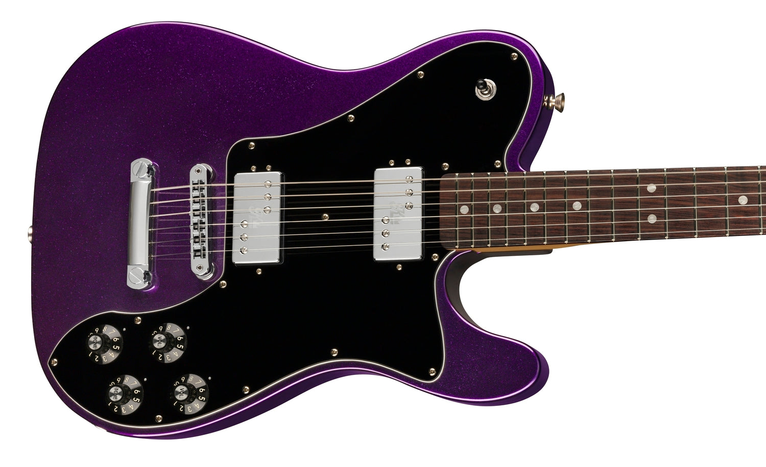 The Fender Kingfish Telecaster Deluxe 6-String Electric Guitar features two custom humbucking pickups voiced for growling, overdriven blues-rock, and an adjusto-matic bridge for perfect intonation. The ’V’-shaped roasted maple neck has a classic feel while the 12-inch radius slab rosewood fingerboard delivers chunky tones and big bends. The mesmerizing Mississippi Night finish has a shimmering purple glow that recalls a dark winter sky in Clarksdale. Other special features include Kingfish’s signature on the headstock, a custom neck plate, and a ‘K’ crown logo on the pickup covers. With guts and sophistication, the Kingfish Telecaster Deluxe delivers scorching blues in a classy package.