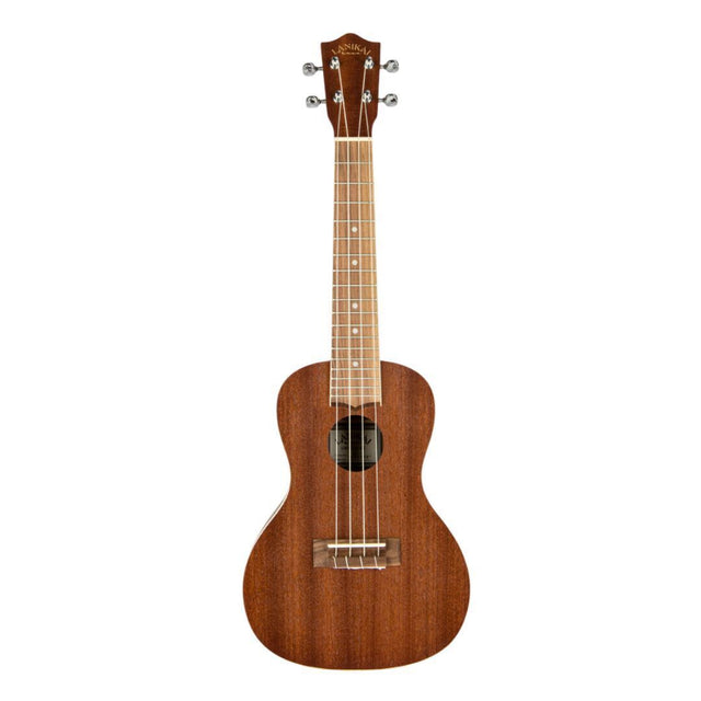 A Lanikai 4-String Mahogany Concert Ukulele provides valuable features such as a wider nut for player comfort, select wood, open back tuners, NuBone XB nut and saddle, D’Addario strings, satin finish, and a padded gig bag.