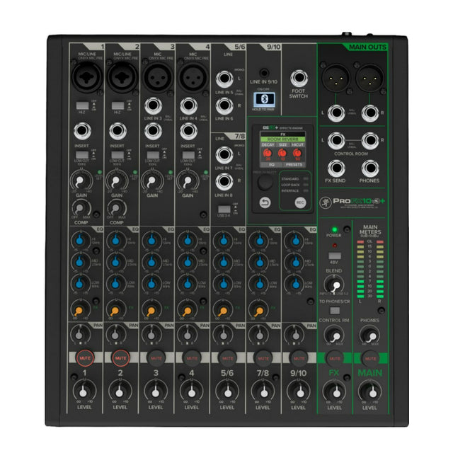 Mackie ProFX10v3 Plus is a professional analog mixer and USB-C audio interface with powerful enhancements for studio-quality recordings and live streams. Capture your performance with Onyx preamps and channel EQ, add computer audio via loopback, bring in calls via Bluetooth and enhance your sound with upgraded GigFX plus effects on a color LCD screen.