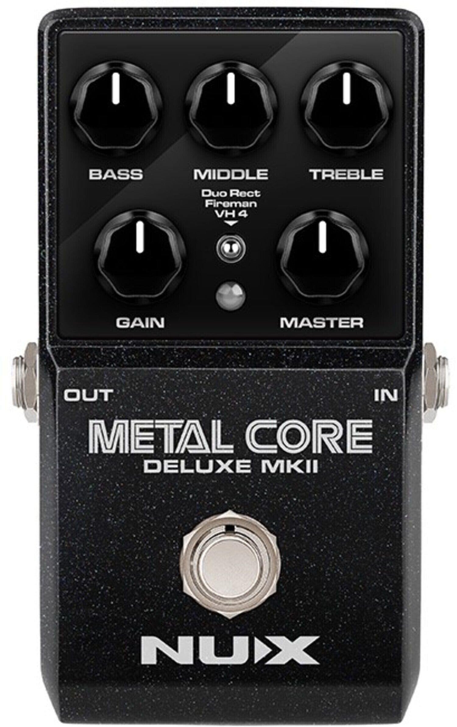 The NUX Metal Core Deluxe MKII is a high-gain preamp pedal with 3 distinctive high-gain amp models including the Duo Rect, Fireman, and VH 4. You can select these models via the 3-way toggle switch.