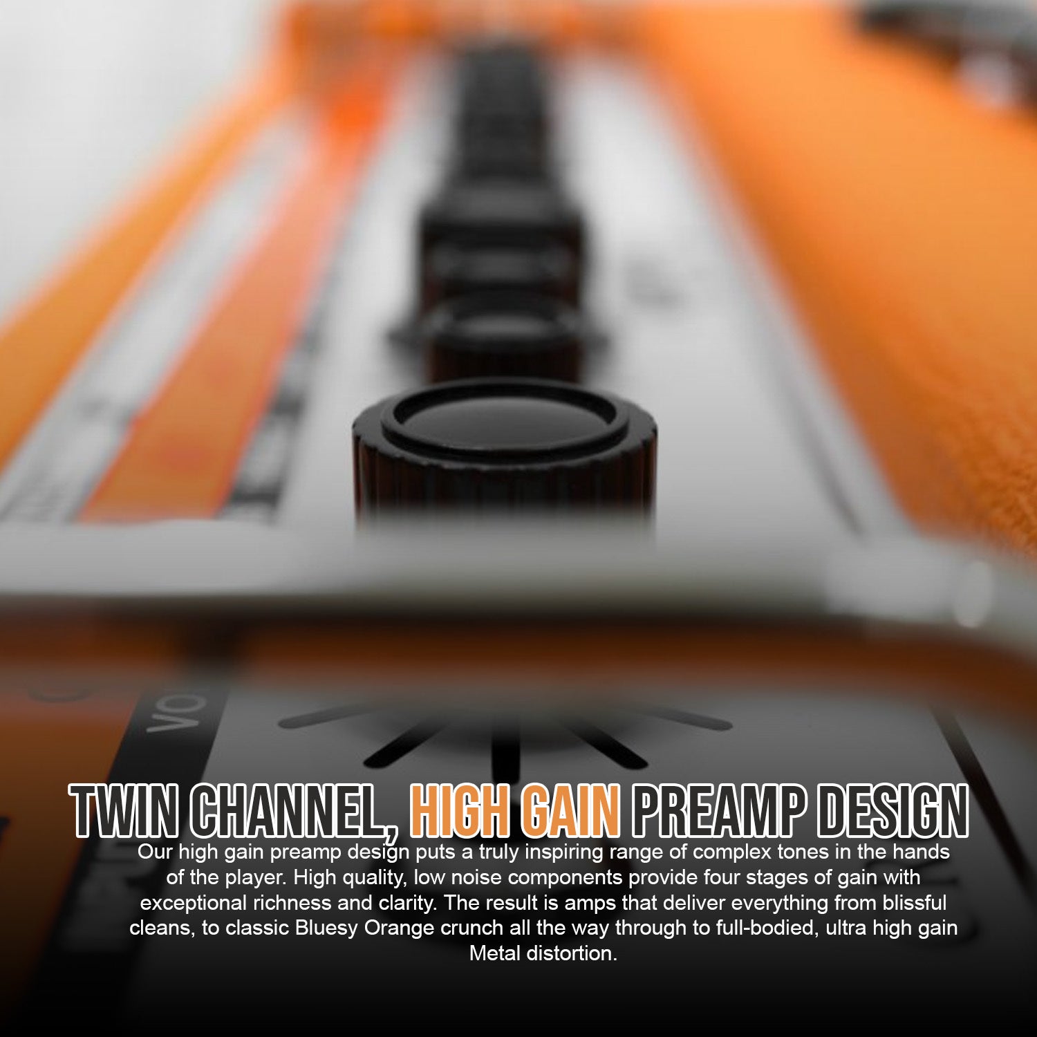 The high gain preamp design puts a truly inspiring range of complex tones in the hands of the player. High quality, low noise components provide four stages of gain with exceptional richness and clarity. The result is amps that deliver everything from blissful cleans to classic Bluesy Orange crunch through to full-bodied, ultra high gain Metal distortion. Clean and Dirty channels can be switched on the amp’s top panel or remotely using the optional footswitch.