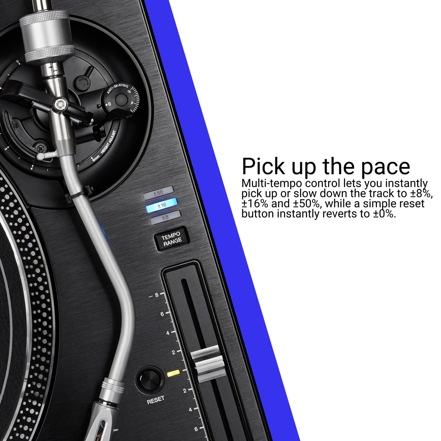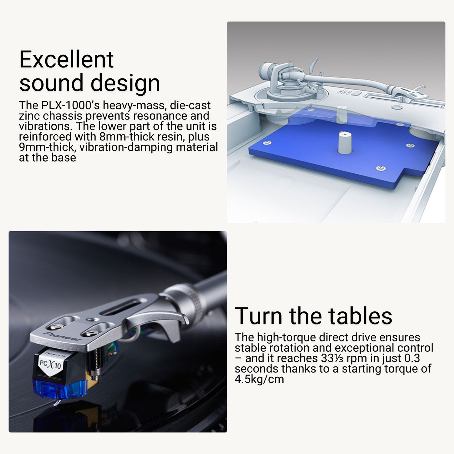 The high-torque direct drive ensures stable rotation and exceptional control and it reaches 331/3 rpm in just 0.3 seconds thanks to a starting torque of 4.5kg per cm (or more).