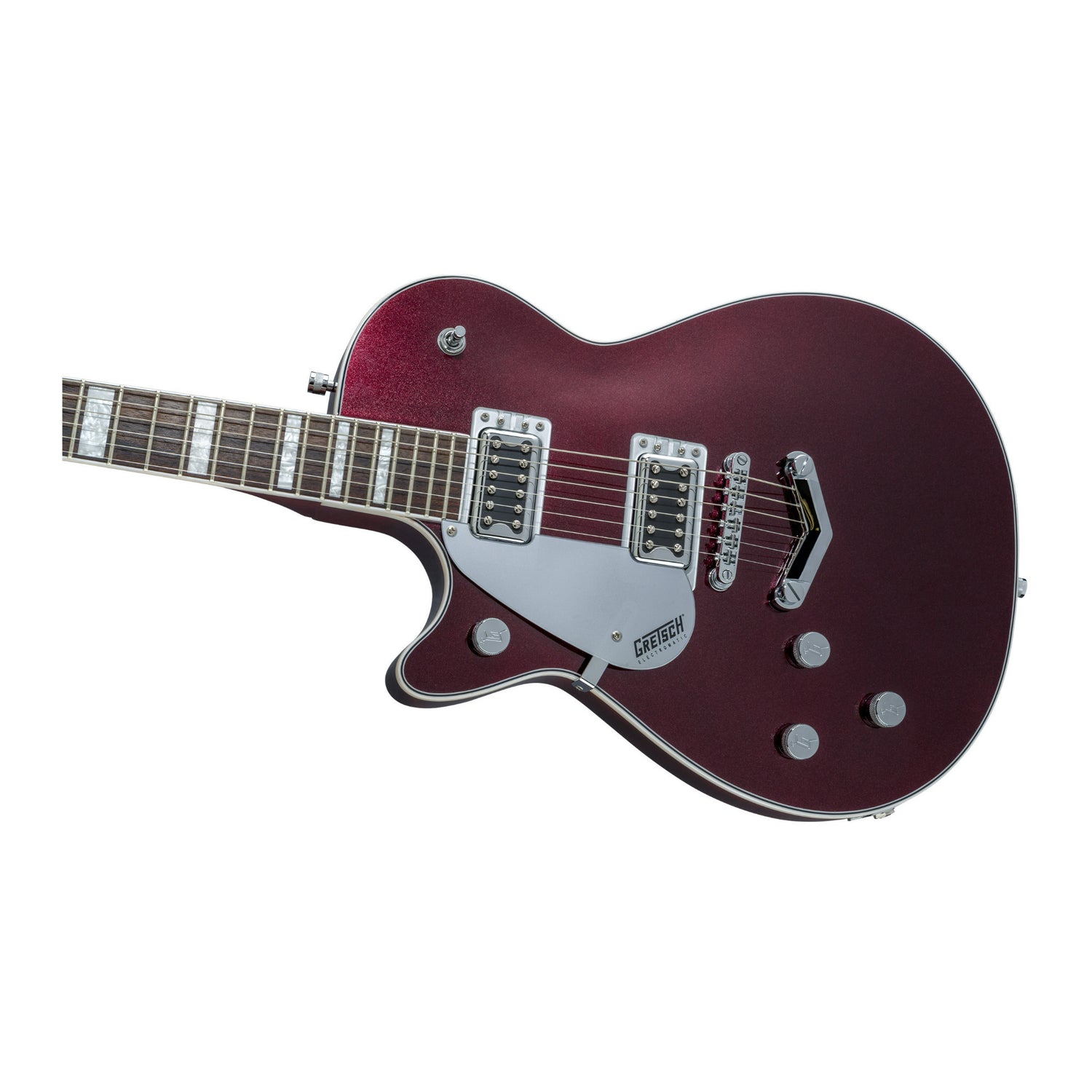 The Gretsch G5220LH Electromatic Jet BT Single-Cut 6-String Left-Handed Electric Guitar in Dark Cherry Metallic features a single-cut chambered mahogany body with a maple top for a strong sonic profile and exceptional acoustic balance, along with a lower set mahogany neck for effortless access and performance. It includes a 12-inch radius laurel fingerboard with 22 medium jumbo frets, dual Black Top Broad'Tron pickups, a master volume with a treble bleed circuit, a master tone, and individual pickup volume controls. Additional features are a V-stoptail, anchored Adjusto-Matic bridge, and upgraded appointments such as a bound headstock, plain-face head cap, vintage-inspired purfling, Big Block inlays, and closed-back tuning keys.