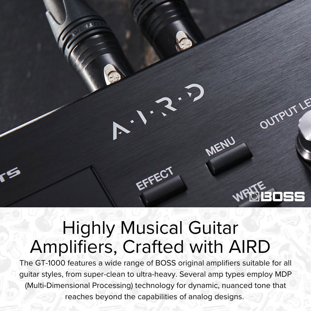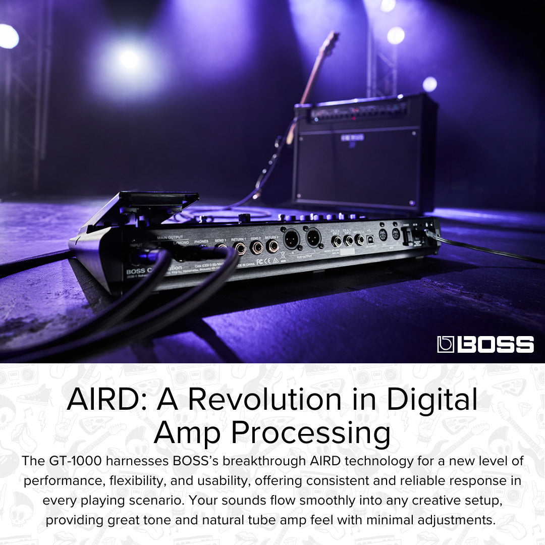 At its core, the GT-1000 harnesses BOSS’s breakthrough AIRD technology for previously unattained musical power. Based on the comprehensive Tube Logic concept behind the renowned Katana, Waza, Nextone, and Blues Cube amplifiers, AIRD takes the amp processor to a new level of performance, flexibility, and practical usability. The tube amplifiers that guitarists love are interactive, highly expressive musical instruments that are far more than the sum of their individual components. The Tube Logic design philosophy fully realizes this interactive experience, and it has been hugely successful in the self-contained guitar amps where it has been employed. However, bringing this approach to a guitar processor like the GT-1000 introduces many challenges, because players will use it with a variety of external amplification systems that add their own characteristics to the sound. BOSS developed AIRD to address these challenges, employing sophisticated techniques to ensure that the GT-1000’s groundbreaking musical response can be consistently experienced with any rig.