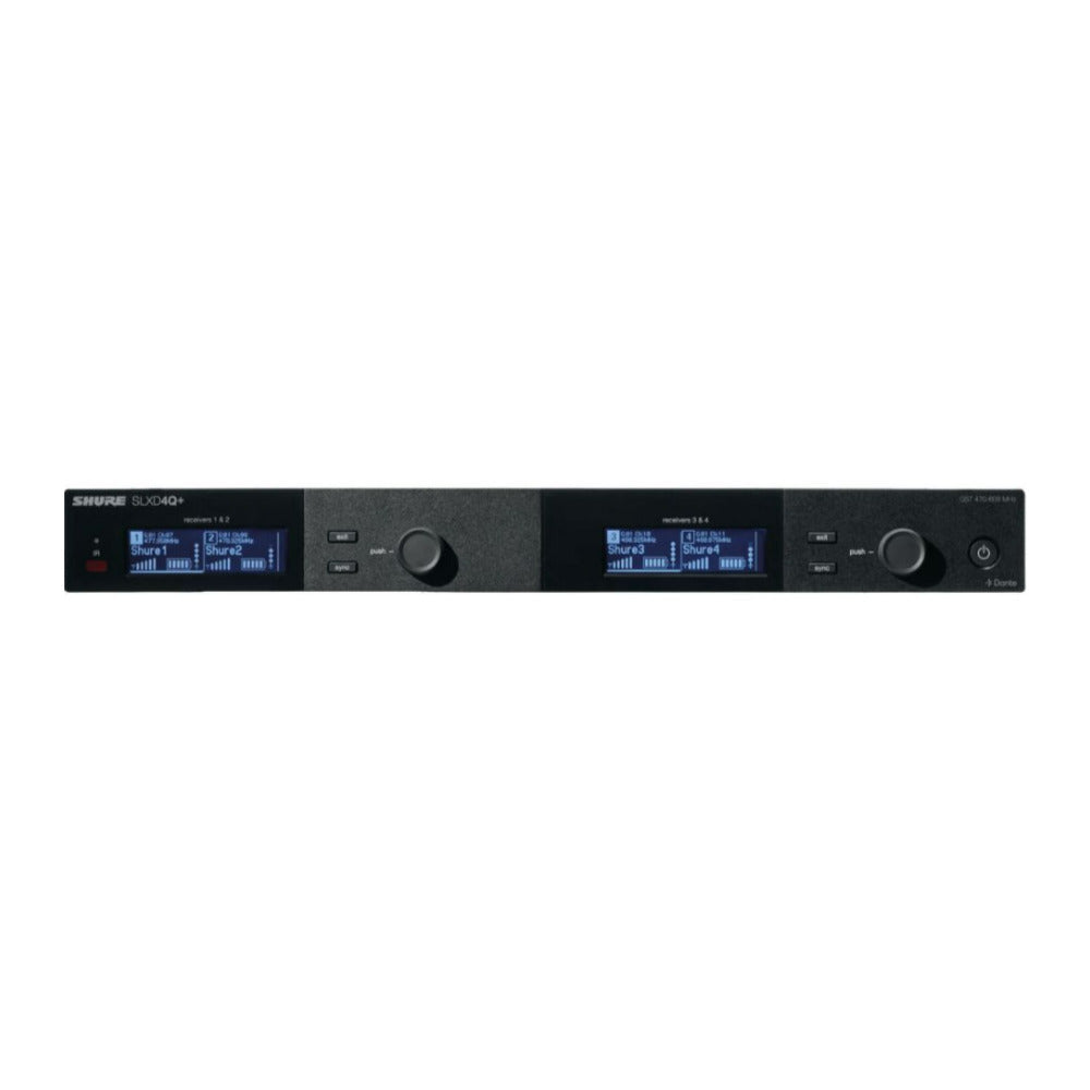 The Shure SLXD4Q Plus Quad Channel Receiver in Black with Dante Audio connectivity is the best choice for streamlining SLX-D digital wireless performance into a space-saving footprint. Featuring expanded capabilities for confident speech presentation and vocal performance - from lecture halls to live entertainment.